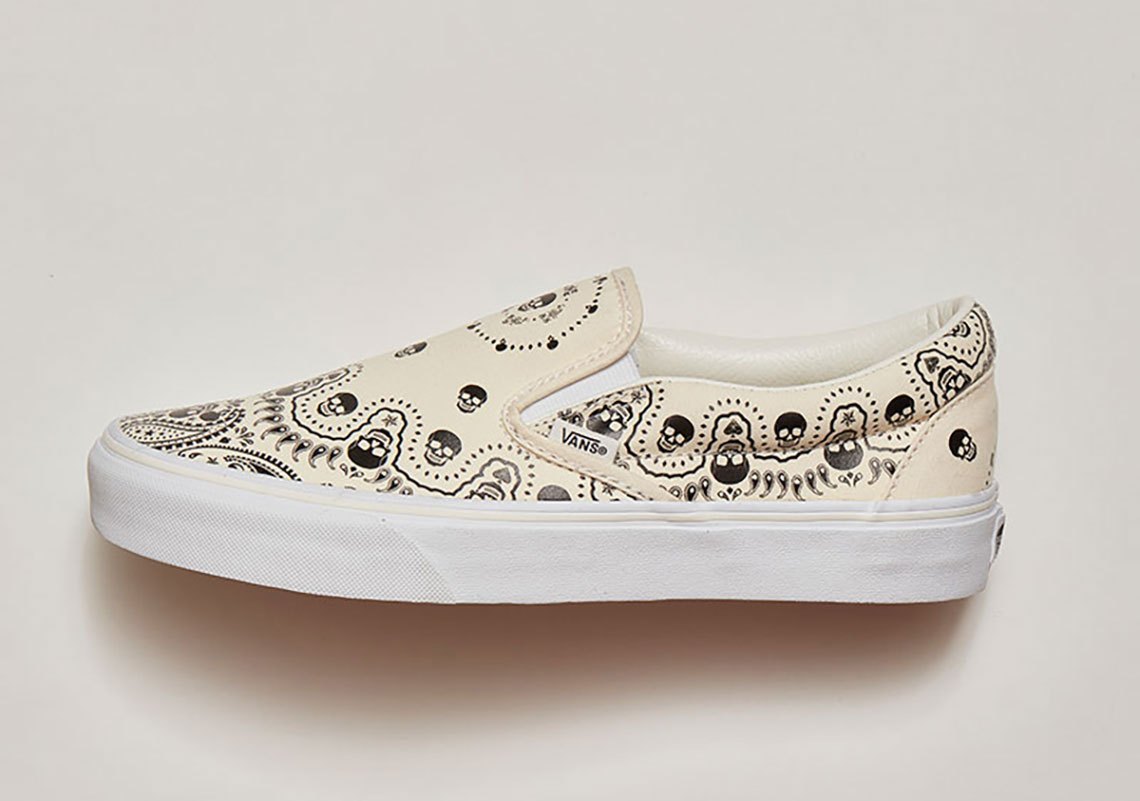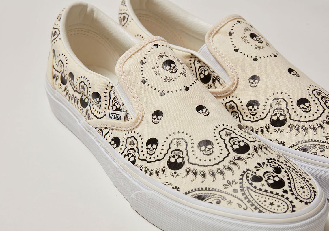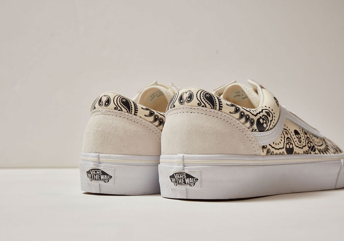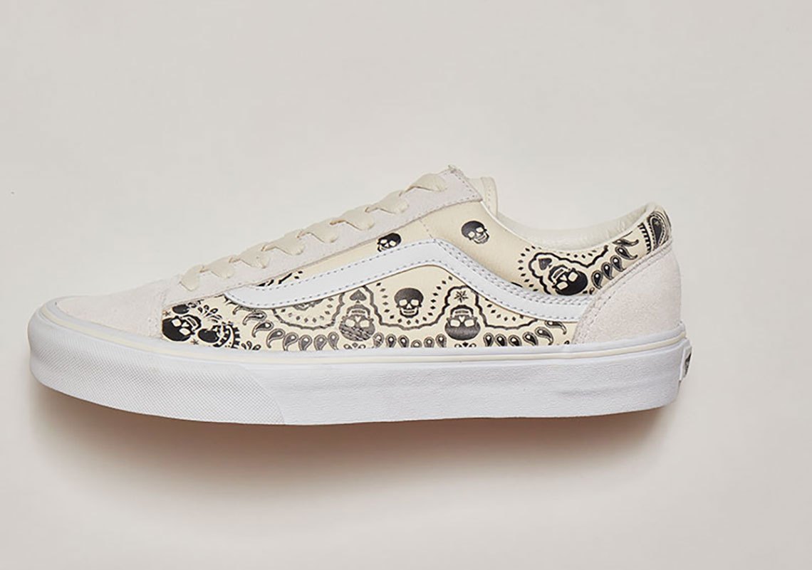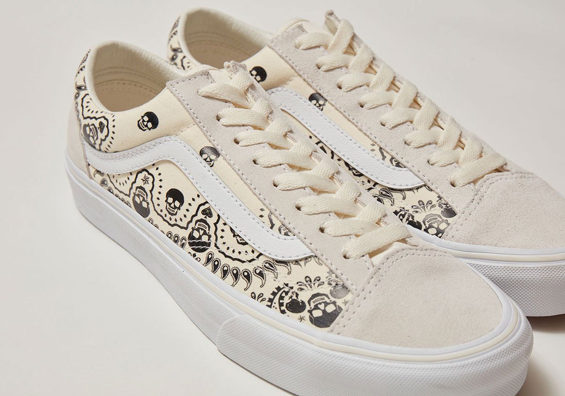Với hoạt tiết “BANDANA” kết hợp đầu lâu màu đen bao phủ trọn vẹn phần thân giày được thấy trong cả bộ sưu tập. VANS STYLE 36 vẫn sử dụng chất da lộn dày dặn, chắc chắn với phần da lộn trắng được chọn làm điểm nhấn cách điệu cho phần mũi giày và thân sau giày. Ngoài ra, biểu tượng Side Stripe cũng mang màu trắng tương tự tạo sự hút mắt trên nền nude BANDANA.