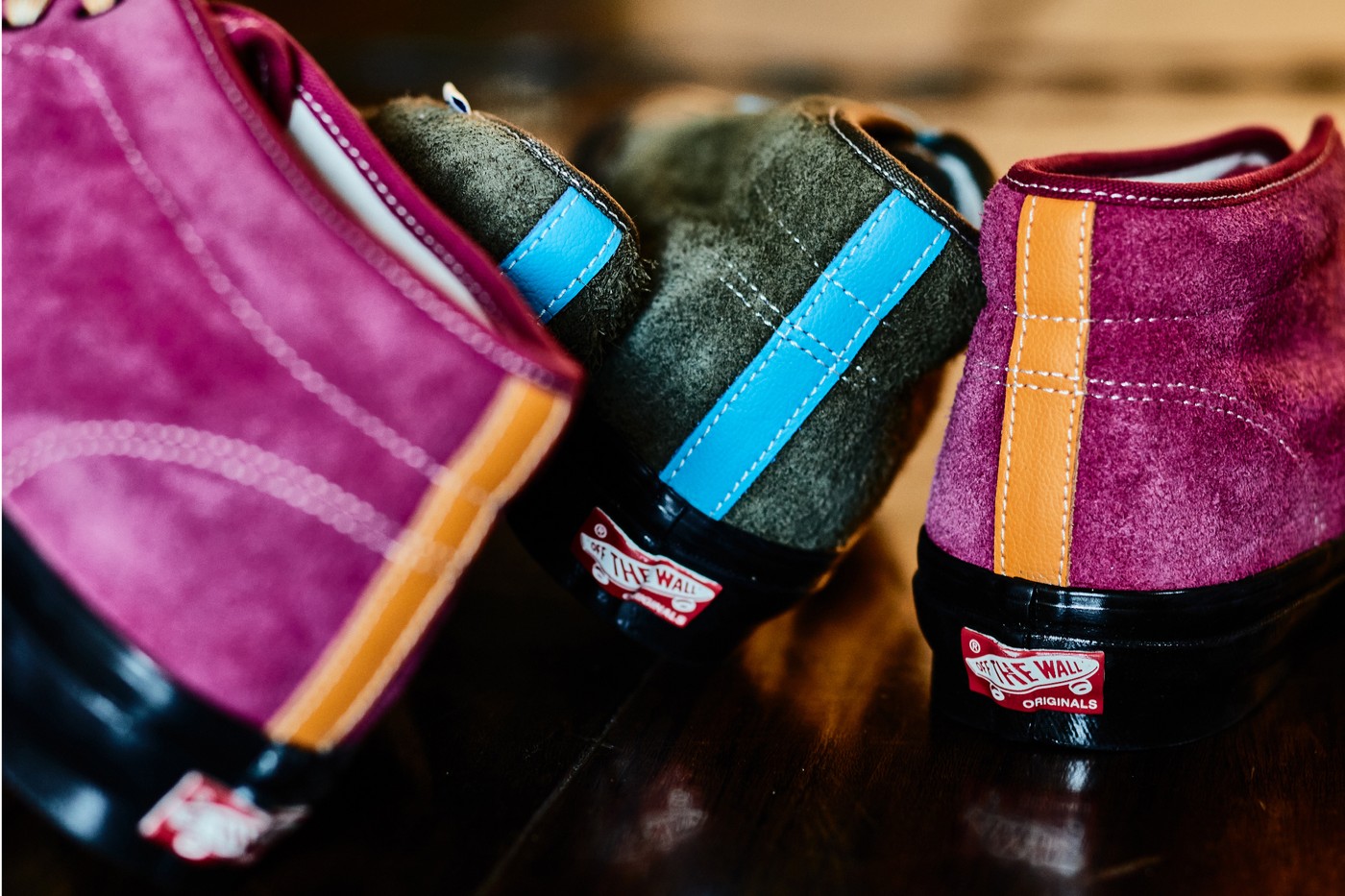 Các miếng lót được sử dụng kỹ càng, tỉ mỉ trong chính sản phẩm này, đường khâu màu trắng lộ ra ngoài và lưỡi giày được làm bằng da lộn nhất quán trên toàn bộ giày, sự khác biệt chính là việc sử dụng các bộ phối màu khác nhau của mỗi phần. Đối với hai sản phẩm đầu tiên, tông màu xanh rêu đậm dẫn đầu bộ sưu tập trong khi các điểm nhấn của màu xanh lam sáng phù hợp với dây buộc, sọc jazz được nổi bật trên chính màu sắc được lựa chọn. Bên cạnh tông màu tối, sản phẩm còn lại nổi bật bởi màu đỏ ruby rực rỡ được cân bằng bằng các điểm nhấn màu cam nhạt.
