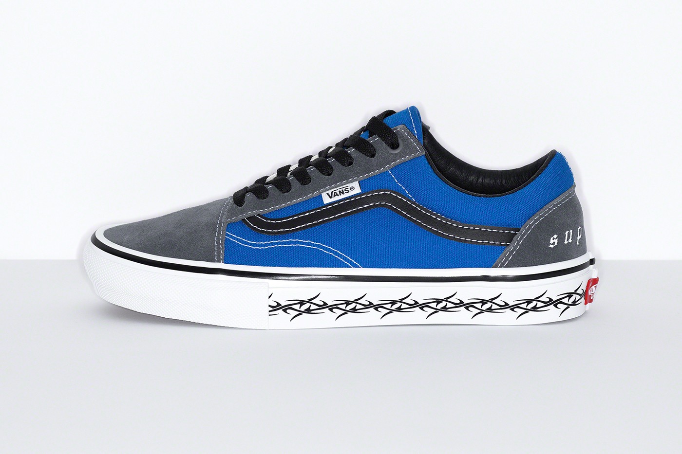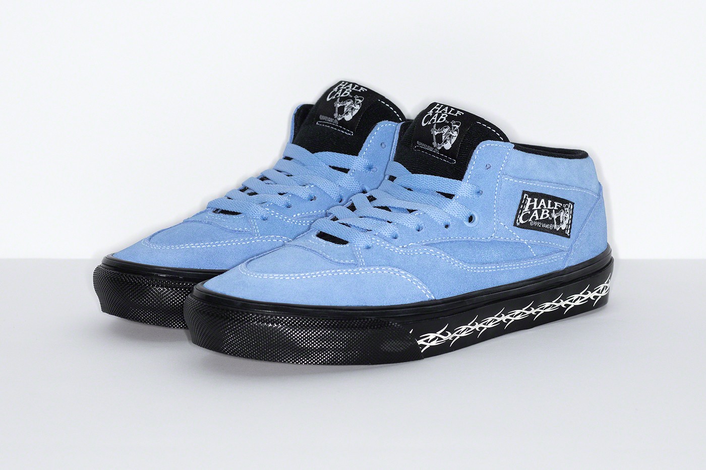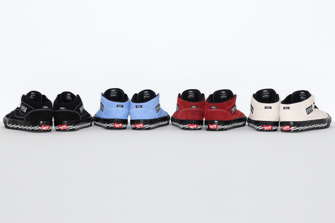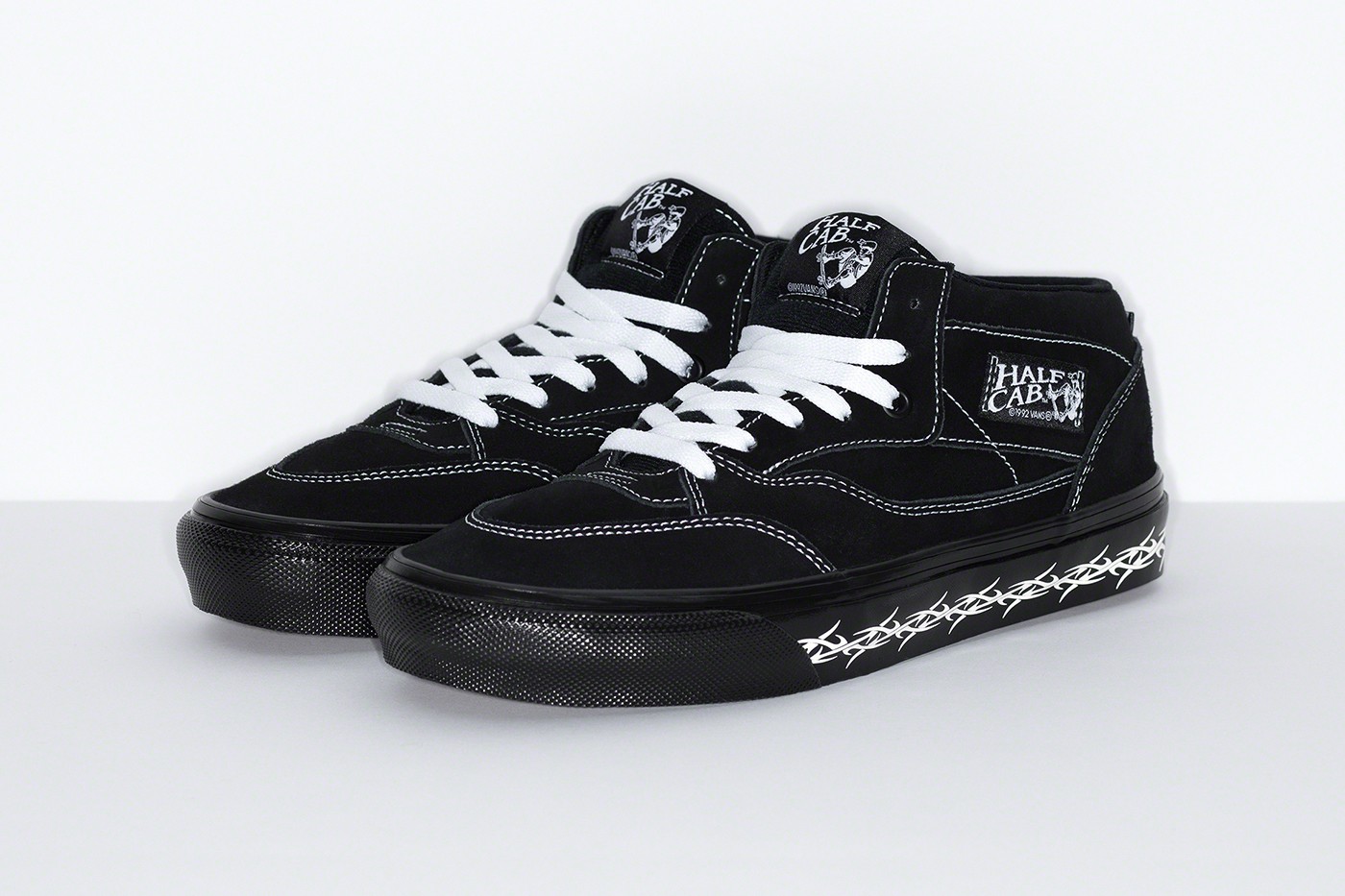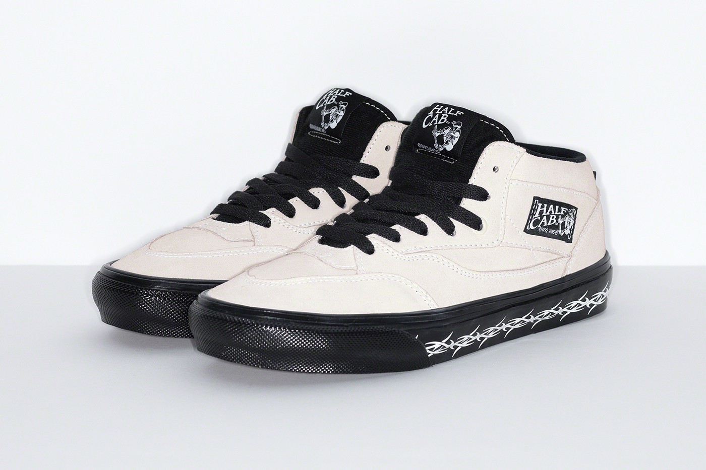 Được sản xuất dành riêng cho Supreme, nhà VANS có trụ sở tại New York đã kết hợp những điểm mới trên các mẫu giày VANS Half Cab và Old Skool. Half Cab có cấu trúc da lộn cao cấp được tạo điểm nhấn bởi lưỡi đệm, logo hãng, lớp lót và đế bằng da. Đôi giày được nâng tầm bởi lớp lót ngoài bằng đế cao su tổ ong lưu hóa. Đế giày đen làm nổi bật họa tiết riêng biệt trắng đơn sắc nhưng đầy thu hút. Thiết kế đế được tiếp tục sử dụng trên Old Skool sử dụng kết cấu trên bằng da lộn và vải canvas cao cấp, lớp lót và đế bằng da, với thương hiệu “SUPREME” được khắc chìm ở gót. Half Cab sẽ có bốn màu, trong khi Old Skool sẽ có ba màu.