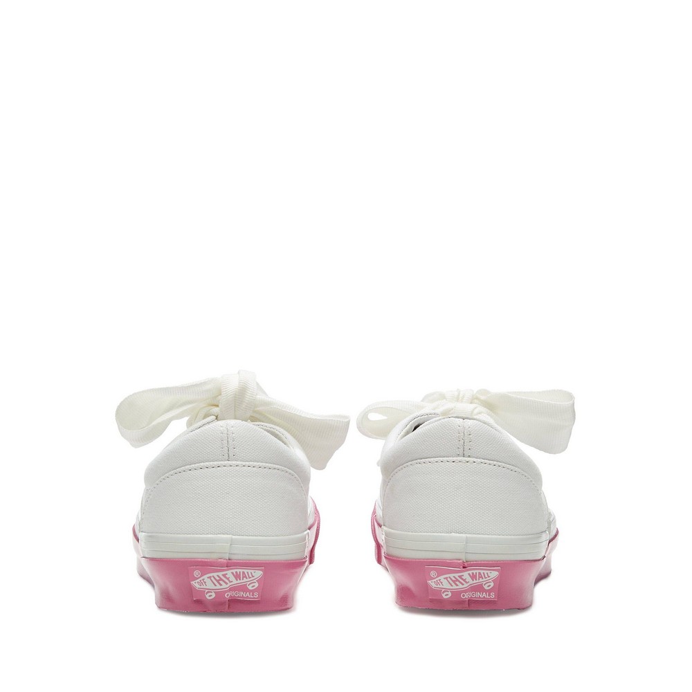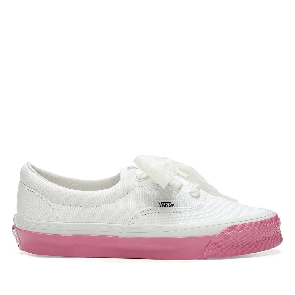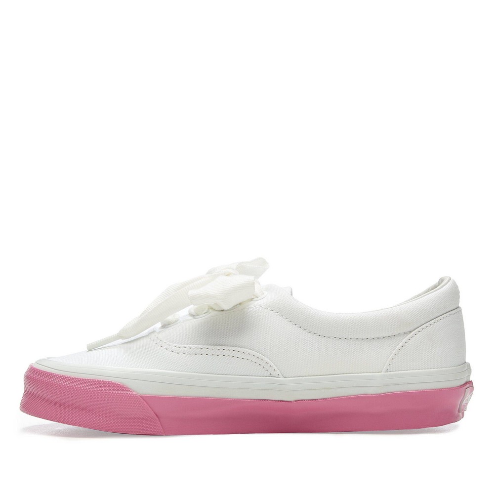 Toàn bộ cặp OG Era LX đều dựa trên màu trắng, với viền đế ngoài bằng chỉ khâu hai màu trắng và hồng. Toàn bộ được thể hiện theo hình dạng tối giản, không có thiết kế cường điệu và chủ đề bắt mắt, giống như nó được thiết kế đặc biệt để vừa vặn với quần áo của CDG Girl. Một đôi giày phù hợp, màu hồng trên đế giày biểu tượng của CDG Girl cũng mang lại sự công nhận mạnh mẽ cho siêu phẩm xinh đẹp này. Lược bớt dây giày thông thường từ nhà VANS, COMME des GARÇONS Girl mạnh dạn đề nghị thay thế bằng dải ruy băng trắng, biểu tượng của sự mềm mại, dịu dàng, ngọt ngào của từng cô gái nhưng vẫn mang bên mình sự năng động mạnh mẽ vốn có. Dây buộc phóng đại được buộc trên vải trắng sạch, giúp nó diễn giải tốt phong cách thời trang tối giản của CDG và phong cách nữ tính mang tính biểu tượng của chi nhánh CDG Girl.