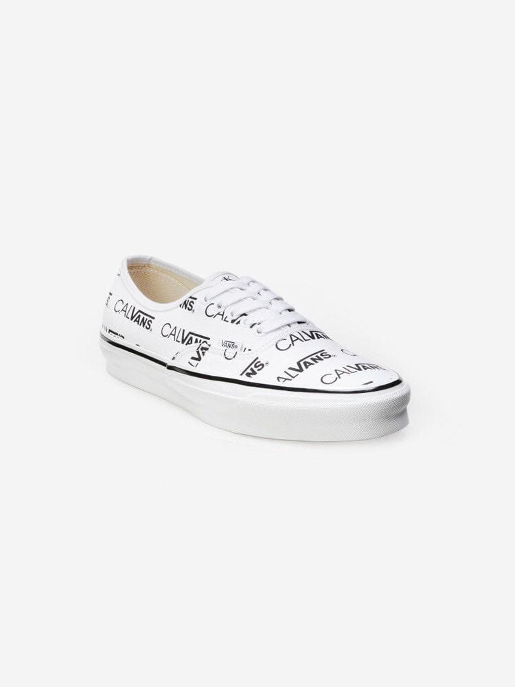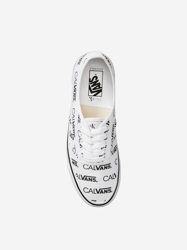 Hình bóng cổ điển của VANS AUTHENTIC được khoác lên mình chất liệu canvas phủ màu trắng với chi tiết đặc biệt là các logo “CALVANS” màu đen được in lặp lại khắp thân giày. Sự kết hợp kiểu chữ truyền thống của cả hai thương hiệu đã thể hiện được “Signature” vô cùng đắt giá, là thứ làm nên cái hồn và đặc trưng phong cách không thể lầm lẫn của nhãn hàng. Tem thương hiệu VANS màu trắng được cố định bên hông giày và nhãn OFF THE WALL độc quyền màu đỏ được tìm thấy trên phần đế cao su trắng của gót giày.