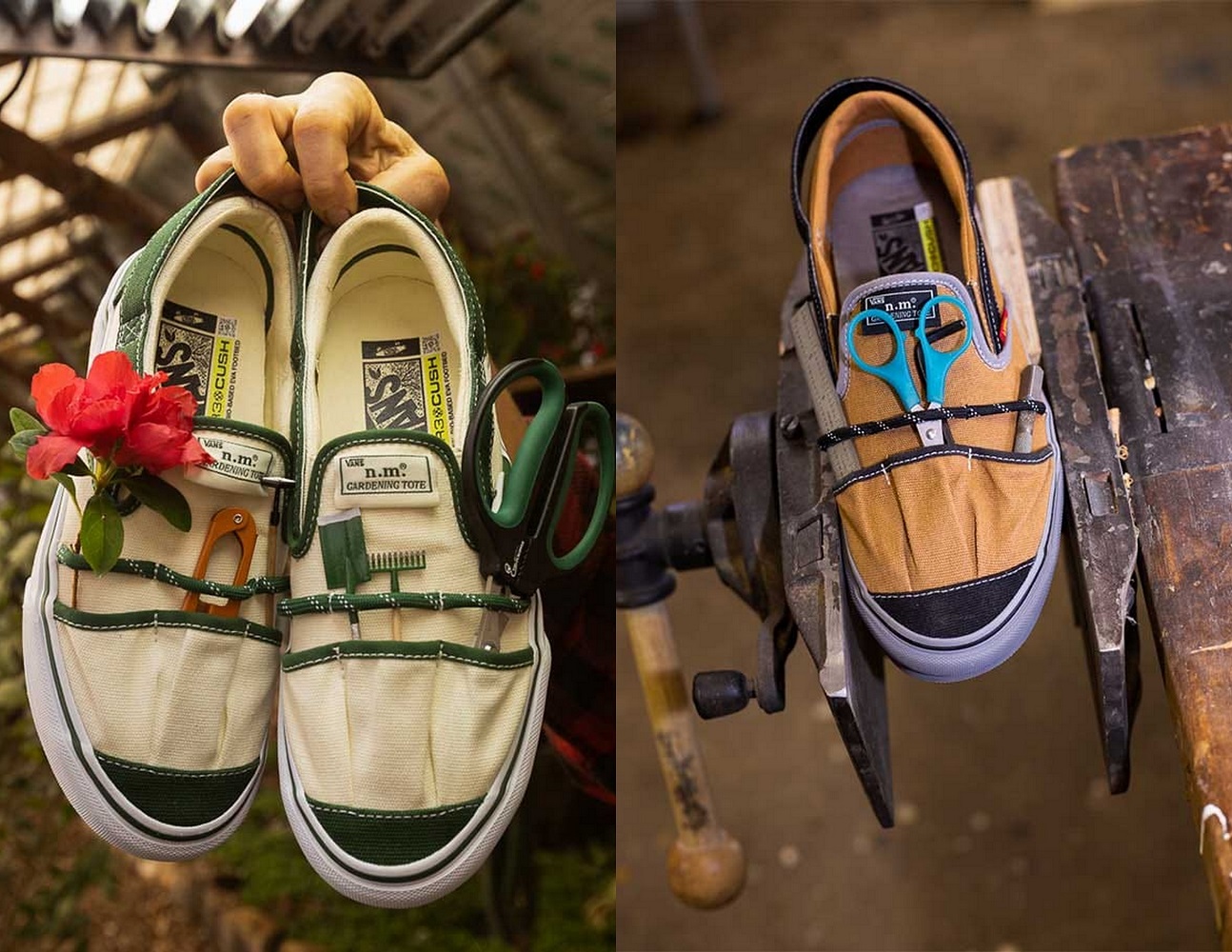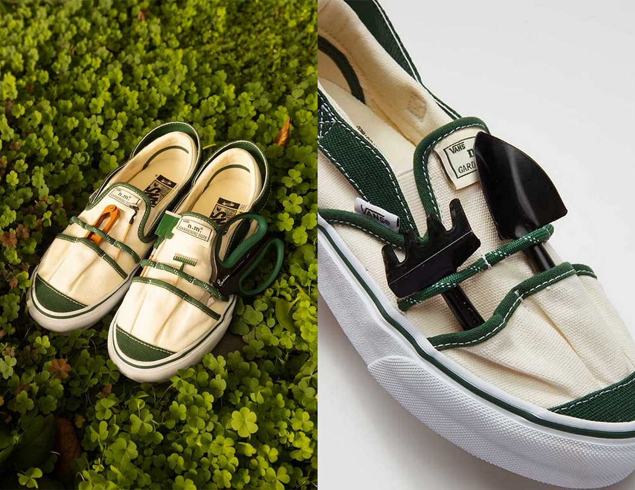 Kết hợp chức năng và thiết kế, cặp hợp tác mang đến một mục đích mới cho hình bóng Slip-On cổ điển, kết hợp các túi đựng đồ cho các vật liệu làm vườn và dụng cụ làm việc ngay trên mũi giày, ý tưởng sáng tạo này mở đầu cho một sự tiện dụng khó có khả năng nghĩ ra được VANS biến nó thành hiện thực. Nay VANS SLIP-ON trở nên gấp đôi gấp ba sự tiện dụng sẵn có. Có sẵn hai phối màu bao gồm một cặp “Trắng/Xanh lục” lấy cảm hứng từ chiếc túi làm vườn cổ điển và một phối màu “Nâu/Xám” liên quan đến những chiếc túi đựng quần áo bảo hộ lao động được sử dụng tại các công trường.