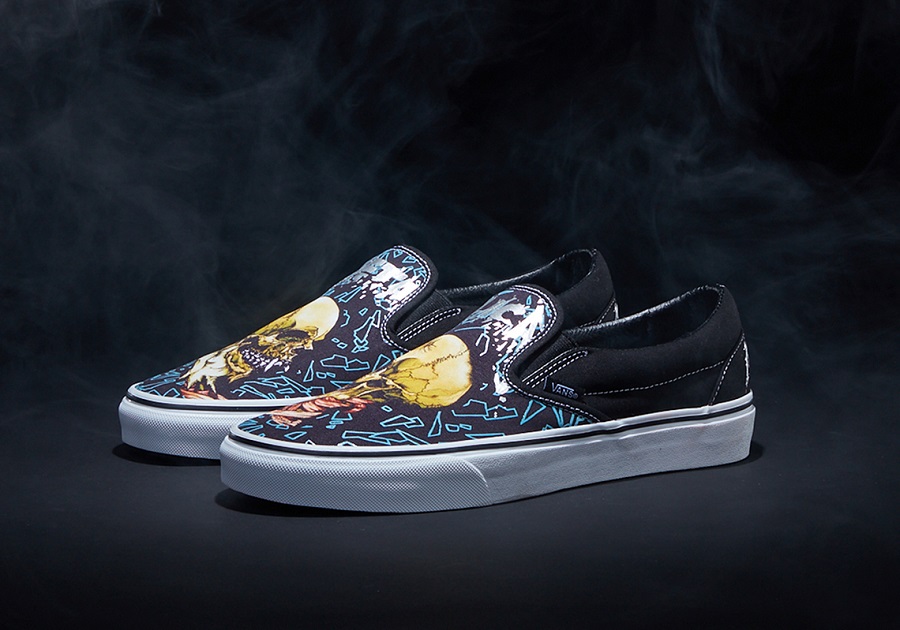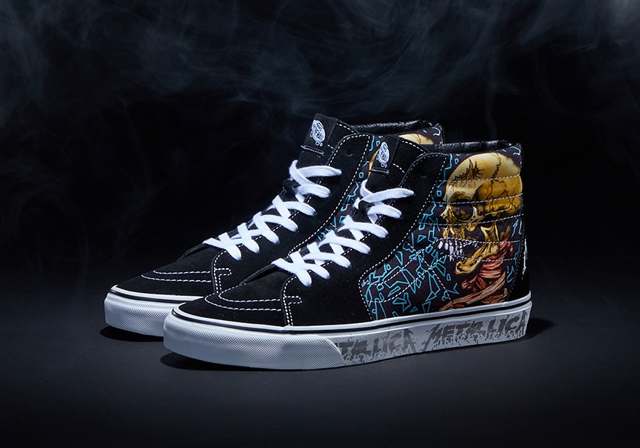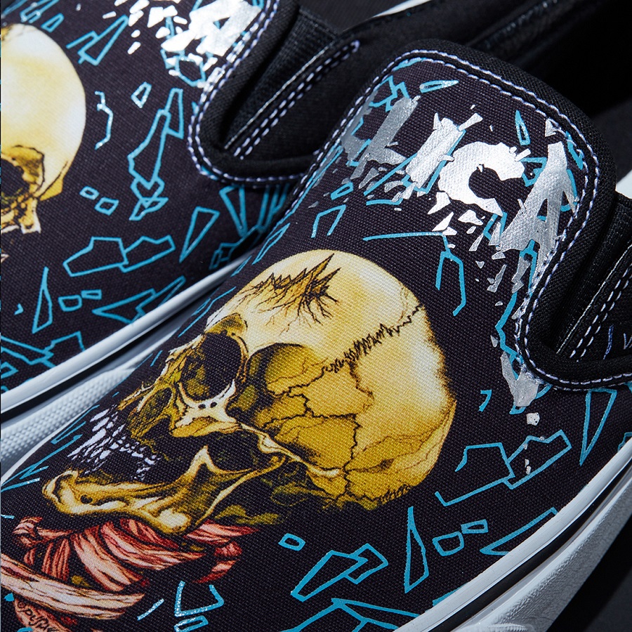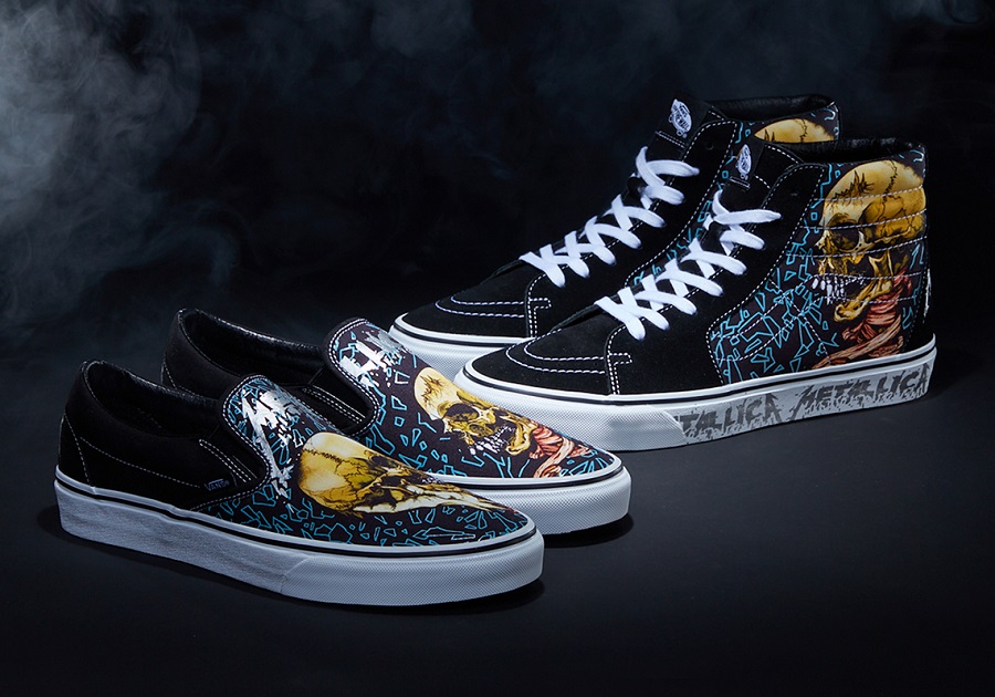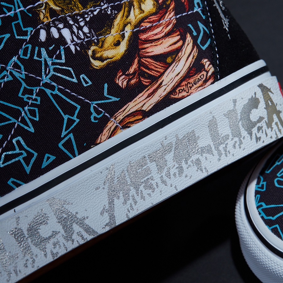 Cùng tiếp nối với sự thành công vang dội, METALLICA đã quyết định dành cho nhà VANS - OFF THE WALL vinh dự cùng đồng hành trong dịp lễ tổ chức kỷ niệm 30 năm “The Black Album” ra đời - một trong những album nổi bật mang đến tiếng vang cho METALLICA. Và VANS nổi tiếng là thương hiệu ưu ái đối tác và tỉ mẩn, tâm huyết trong mỗi sản phẩm đưa ra thị trường. Vì thế nên đối với bộ sưu tập ý nghĩa METALLICA x VANS được thương hiệu thiết kế dựa trên nền tảng cả hai sản phẩm thịnh hành chính là VANS SLIP-ON và VANS SK8-HI cùng với các bản in đầy nghệ thuật được thiết kế bởi nghệ sĩ huyền thoại PUSHEAD. Đối với phiên bản VANS SK8-HI trong bộ sưu tập METALLICA x VANS được lựa chọn tone chủ đạo Black - Blue kết hợp cùng thiết kế mang hơi hướng Creepy nhưng cam đoan về tính thời trang và hút mắt. Cùng với dòng chữ “METALLICA” - tên thương hiệu đối tác được VANS ưu ái khắc họa rõ nét bên hông đế giày theo tone nhũ xám sang trọng. Bên cạnh đó, METALLICA x VANS - SLIP-ON được thương hiệu thiết kế cùng tone màu với phân khúc trước nhưng với nét tượng trưng sẵn có từ “giày lười” toàn bộ đồ hoạ cùng họa tiết được phô bày trọn vẹn ở phần Upper, và chắc chắn không thể thiếu tên thương hiệu “METALLICA” nhũ xám đồng điệu.