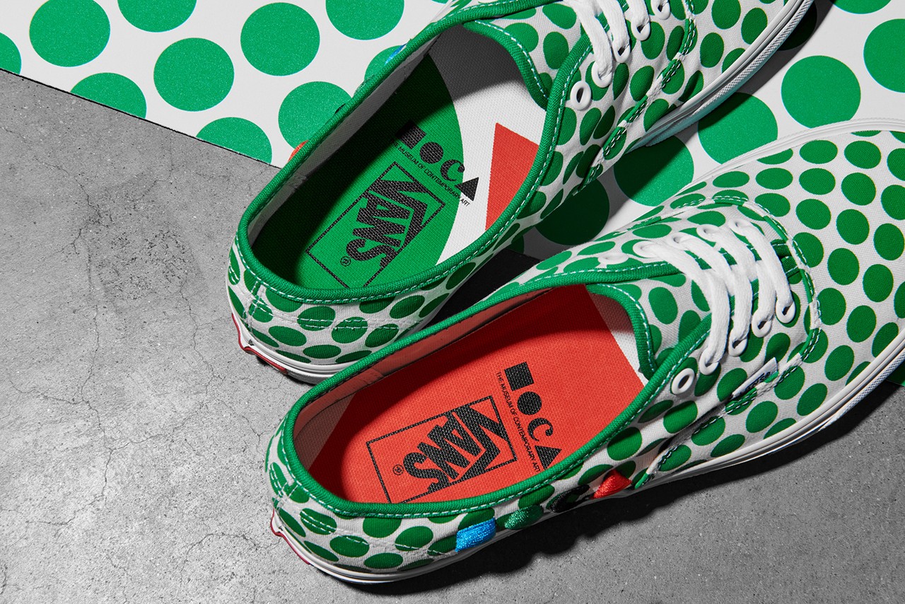 Mỗi bức ảnh trong phạm vi bộ sưu tập này được tạo kiểu theo cách độc đáo của riêng nó về khả năng chặn màu, nhưng tất cả chúng đều có các biểu tượng thiết kế đồ họa do Ivan Chermayeff và Tom Geismar thực hiện vào những năm 1980. Loại hào nhoáng nhất trong số đó là đôi Authentic có họa tiết chấm bi trắng và xanh lá. Biểu tượng tam giác, vuông, khuyết và tròn được hình dung đến chữ MOCA sẽ trở thành điểm nhấn chủ yếu của bộ sưu tập biểu tượng văn hóa California này của MOCA và VANS xuất hiện ở hai bên giày. Slip-Ons chủ yếu được trang trí bằng màu trắng, nhưng có họa tiết checkerboard màu xanh lam và trắng xung quanh cổ áo và phần upper chia đều từ viết tắt MOCA. Sk8-His chọn đi với họa tiết hai tông màu với màu trắng là màu bao phủ hầu hết mặt đất. Liền kề là màu đỏ đậm trên gót giày trong khi thương hiệu màu xám mờ được tô điểm trên mỗi bàn chân. Cuối cùng là EVDNT UltimateWaffle với lựa chọn thẩm mỹ thang độ xám.
