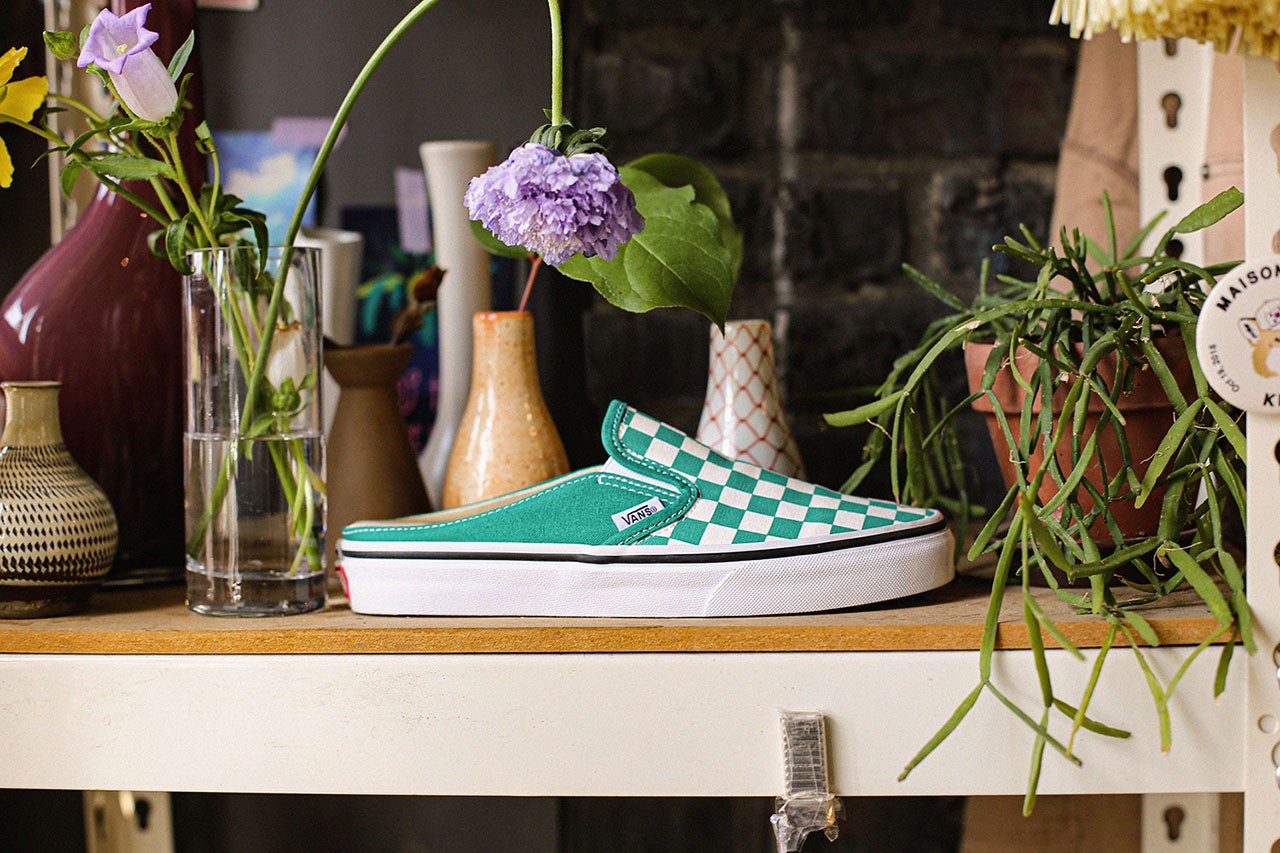 Old Skool Mule được xây dựng bằng da lộn và vải bạt phía trên có dấu với sọc Jazz trắng mang tính biểu tượng của VANS ở mặt bên. Slip-On Mule có in hình bàn cờ cổ điển trong các kết hợp xanh-trắng và vàng-trắng. Cả hai đôi giày đều có thương hiệu logo ở gót