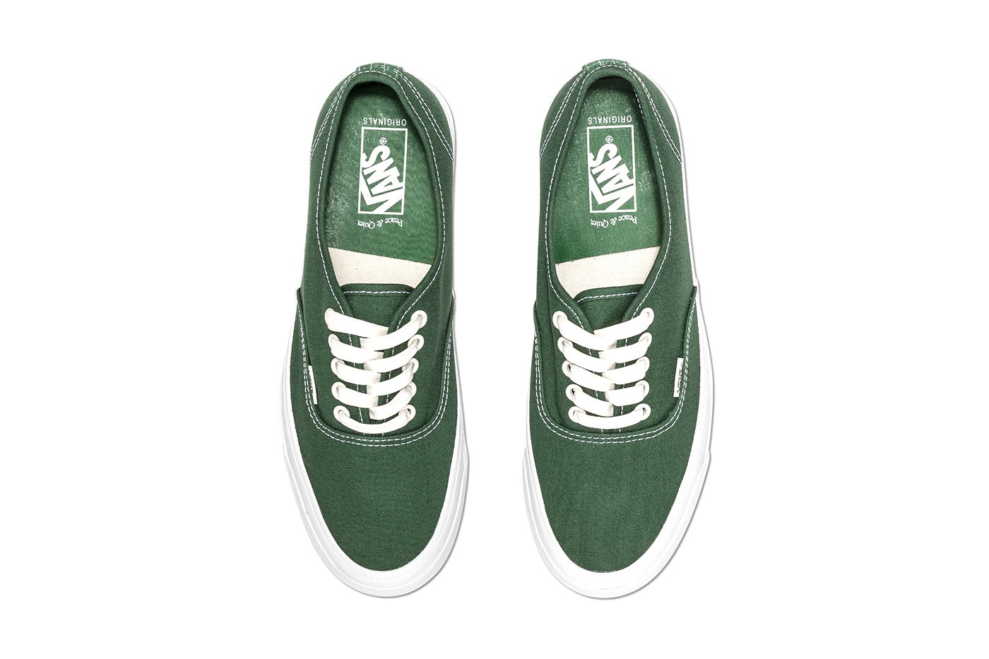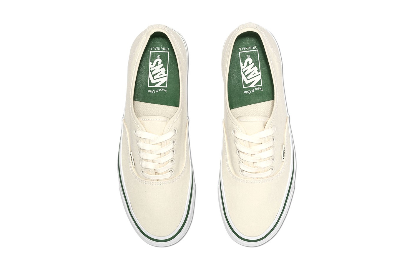Hoàn thiện sản phẩm là branding VANS – OFF THE WALL nền xanh chữ trắng basic được in nghiêng trên đế. Đồng thương hiệu từ Museum of Peace & Quiet có thể được tìm thấy trên đế giày, túi đựng kèm và hộp đặc biệt.