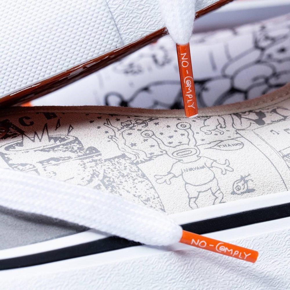Các bức tranh graffiti xuất hiện trong album, bao gồm các đường nét đơn giản, được thể hiện bằng tông màu xám trắng của thân giày, trong khi các chi tiết như dấu vải bên, đầu ren giày, đế ngoài bánh quế và dấu gót chân được trang trí với màu cam. Sê-ri đồng thương hiệu No-Comply x Vans sẽ được công bố chính thức vào tháng 3 và sẽ được phát hành độc quyền trong No-Comply.