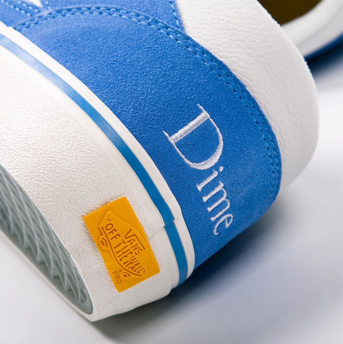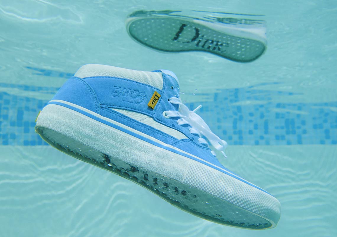 Ở đây, Vans x Dime Half Cab lựa chọn hình ảnh Anaheim cho sự hợp tác của họ. Tông màu chính của sản phẩm có phần dịu mắt bởi sắc xanh nhẹ pha chút màu trắng được thể hiện trên dây giày và phần viền cổ chân. Mặt dưới của giày táo bạo đề dòng chữ Dime nổi bật.