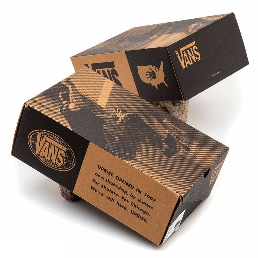 Uprise đã ra mắt cùng với một hộp giày Vans theo phong cách thập niên 90: hình ảnh của một chiếc ván trượt cùng thương hiệu trên đỉnh hộp giày và Logo Vans ở bên cạnh.