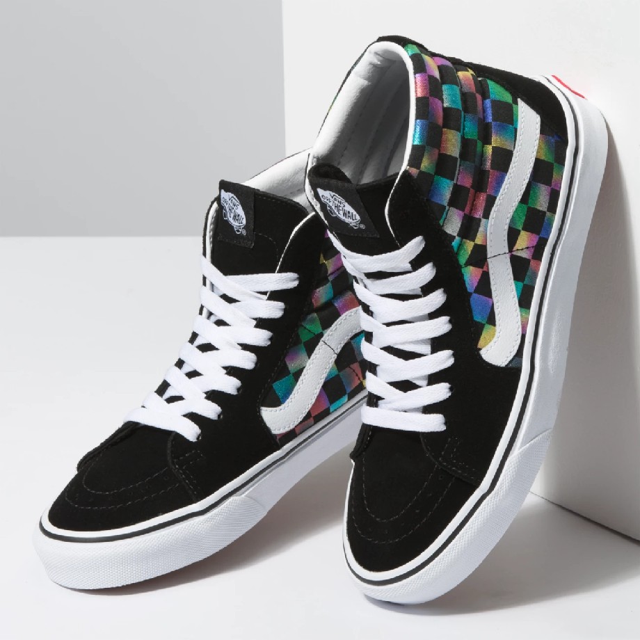 Thoạt nhìn bạn sẽ bị thu hút bởi những ô vuông đầy màu sắc, lấp lánh như được đổ kim tuyến lên trên bề mặt. Có thể nói những sản phẩm được sử dụng hiệu ứng “Iridescent” đều làm tăng cảm giác sang trọng cho người dùng. Đặc biệt là với những ai yêu thích sự nổi bật, độc quyền thì VANS IRIDESCENT CHECK SK8-HI BLACK chính là thiết kế bạn chắc chắn phải sở hữu trong bộ sưu tập giày của mình.