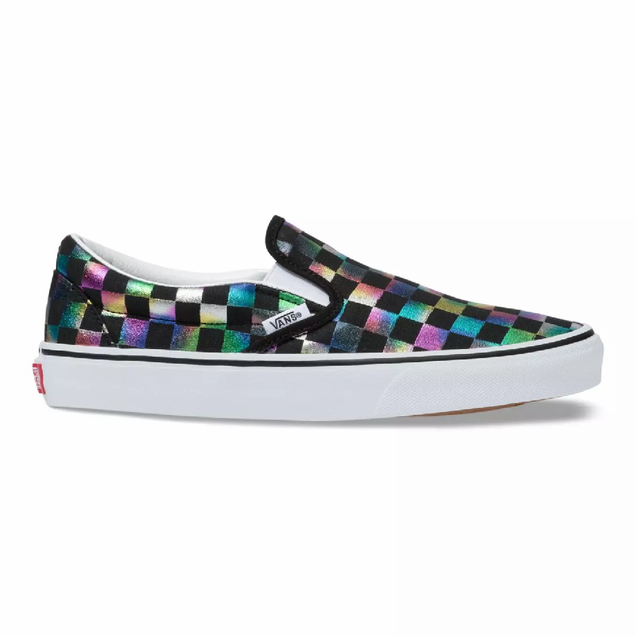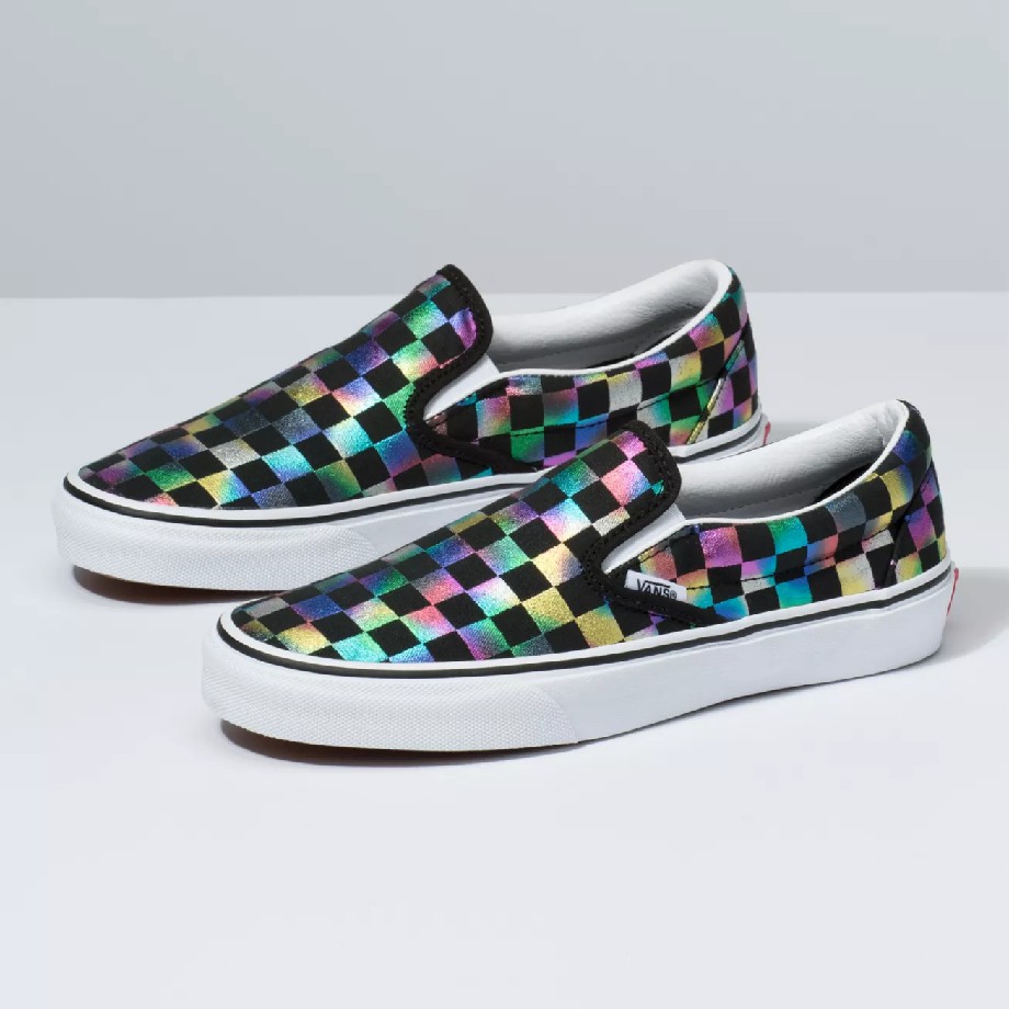 Thoạt nhìn bạn sẽ bị thu hút bởi những ô vuông đầy màu sắc, lấp lánh như được đổ kim tuyến lên trên bề mặt. Có thể nói những sản phẩm được sử dụng hiệu ứng “Iridescent” đều làm tăng cảm giác sang trọng cho người dùng. Đặc biệt là với những ai yêu thích sự nổi bật, độc quyền thì VANS IRIDESCENT CHECK SLIP-ON BLACK chính là thiết kế bạn chắc chắn phải sở hữu trong bộ sưu tập giày của mình.