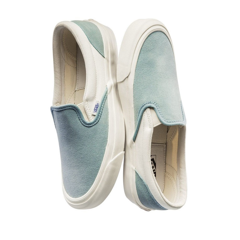 Đôi giày vẫn dựa trên form thiết kế SLIP ON nguyên bản, dòng giày này cũng nhận được rất nhiều sự yêu mến của đông đảo những bạn trẻ đam mê thời trang vì sự tinh tế trong thiết kế cũng như sự tiện dụng trong quá trình sử dụng. Với phối màu được lấy cảm hứng những gam màu của các phiến đá trong tự nhiên, phần mũi giày và gót giày được phủ một màu xanh lạ lắm trên nền chất liệu suede cao cấp, phần thân giày thì được sử dụng chất liệu vải canvas nhưng dày dặn hơn phiên bản thường. Phần đế giày được nâng cao hơn so với phiên bản thường cộng với việc bên trong lót giày được may thêm một lớp da, điều này chắc chắn sẽ giúp đem lại trải nghiệm mang êm ái nhất có thể. Bên cạnh đó, phần dây cao su màu đen quen thuộc cũng được lược bỏ khiến cho đôi giày trở nên hoàn thiện và thanh thoát hơn. Cuối cùng, đôi giày sẽ được đi kèm với phần hộp giày đặc biệt được thiết kế riêng cho dòng giày VANS Vault, cho thấy VANS đã đầu tư hết sức kĩ lưỡng cho một sản phẩm chất lượng nhất.