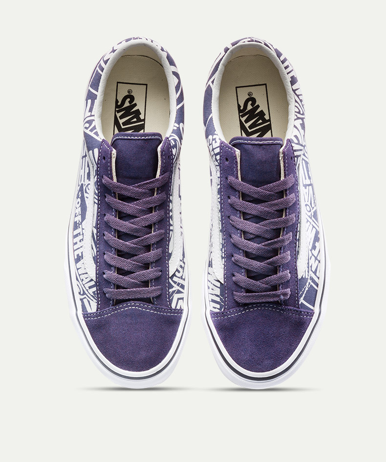 Là trong 1 trong 2 thiết kế được VANS lựa chọn trong BST lần này, OLD SKOOL được khoác lên mình 1 vẻ ngoài hết sức bắt mắt. Logo OFF THE WALL được thể hiện độc đáo với phong cách all over print thời thường cùng với phối màu tím hết sức ấn tượng. Được biết logo này là thông điệp mà VANS luôn muốn truyền tải đến những bạn trẻ với tinh thần dám nghĩ dám làm, luôn sáng tạo và bức phá. Các chi tiết trên đôi gìay được chăm chút, sử dụng cùng màu mới tông màu chủ đạo khiến cho đôi giày trở nên hoàn thiện hơn như : dây giày, khoen xỏ dây, đường chỉ cao su chạy quanh đế giày,.. Đôi giày vẫn được sử dụng những chất liệu giống như những phối màu OLD SKOOL trước đây như da lộn, da bóng cũng như là vải canvas, sự phối hợp đa chất liệu này đem lại sự cao cấp, nâng cao sự bền bỉ thêm cho đôi giày.