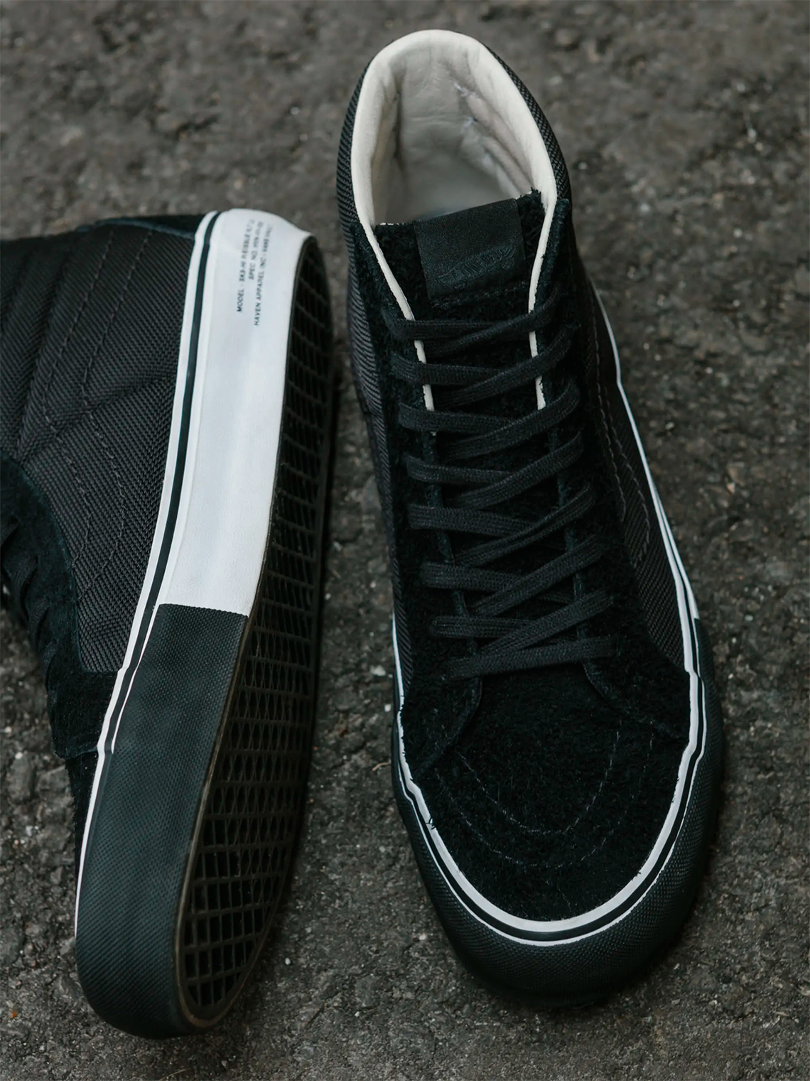 Bên cạnh mẫu thiết kế màu be pha trắng đen, một bảng màu khác có nét mạnh mẽ hơn là phủ toàn bộ phần trên của giày bằng màu đen tuyền kết hợp đế giày trắng – đen. Mẫu Vans Ballistic Nylon full đen không còn mang nét thanh lịch của sắc be, mà thay vào đó là chút nổi loạn và quyết liệt được các nhà thiết kế khéo léo lồng vào trong đôi giày.