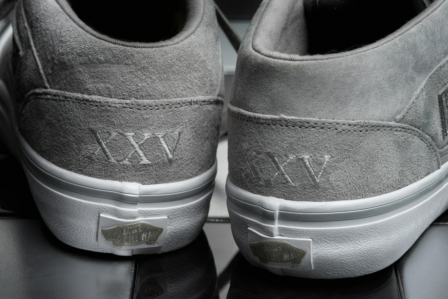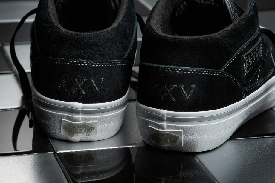 Điểm nhấn cao cấp từ da lộn, chi tiết bạc ánh kim và họa tiết số la mã ở chân gót, 25 Years Anniversary Vans Half Cab được trang bị tính năng đổi mới hiệu suất của Pro Classics của Vans Pro Skate, với bộ sockliner ULTRACUSH HD hỗ trợ cho đệm đàn hồi và độ dẻo dai tiên tiến, và các lớp phủ được gia cường DURACAP trong các vùng mài mòn cao để đảm bảo độ bền nhất quán theo thời gian của dòng giày này.