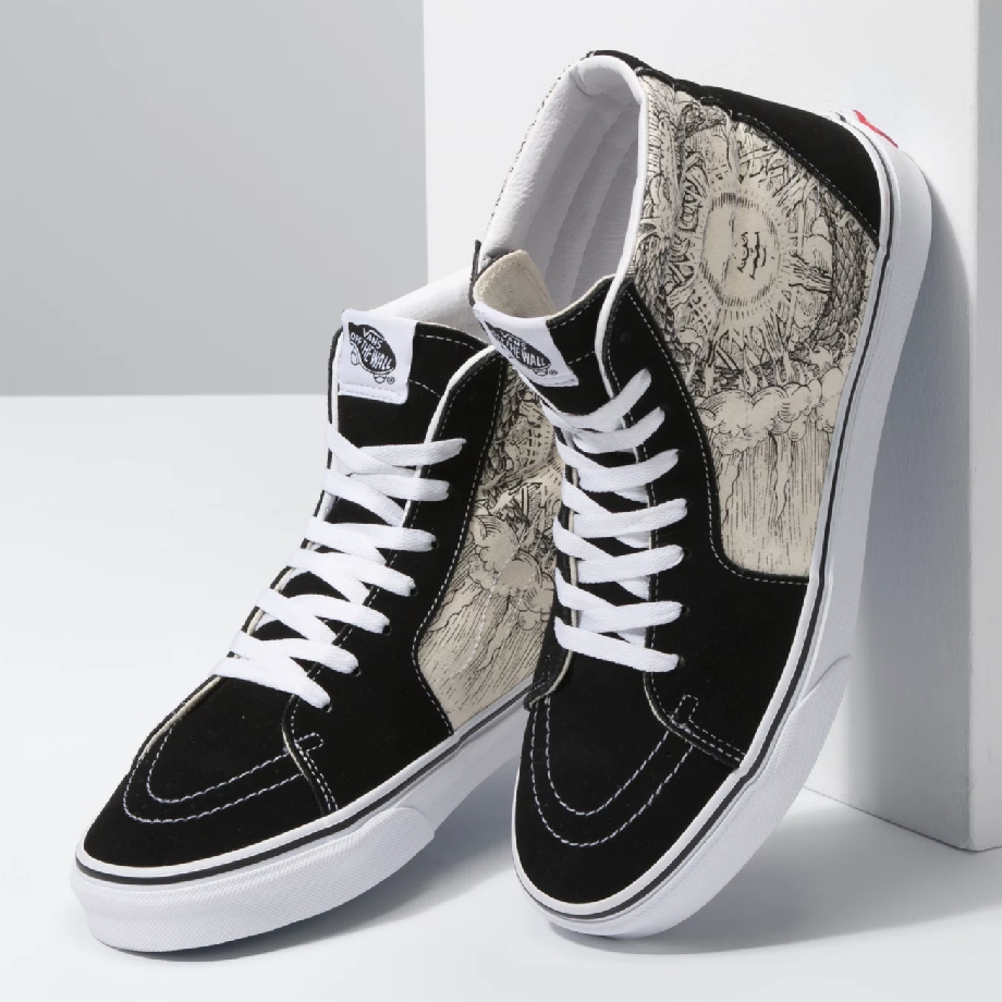 Vans OUROBOROS Sk8-Hi được tạo nên từ hai màu sắc truyền thống của nhà Vans là Black/True White, chất liệu làm từ da lộn đen trên nền vải canvas trắng. Họa tiết huyền thoại không còn nằm trên phần thân trên của giày như hai dòng sản phẩm còn lại, mà được đặt ở hai bên giày, khiến chi tiết trở nên dễ nhìn, hài hòa và bắt mắt.