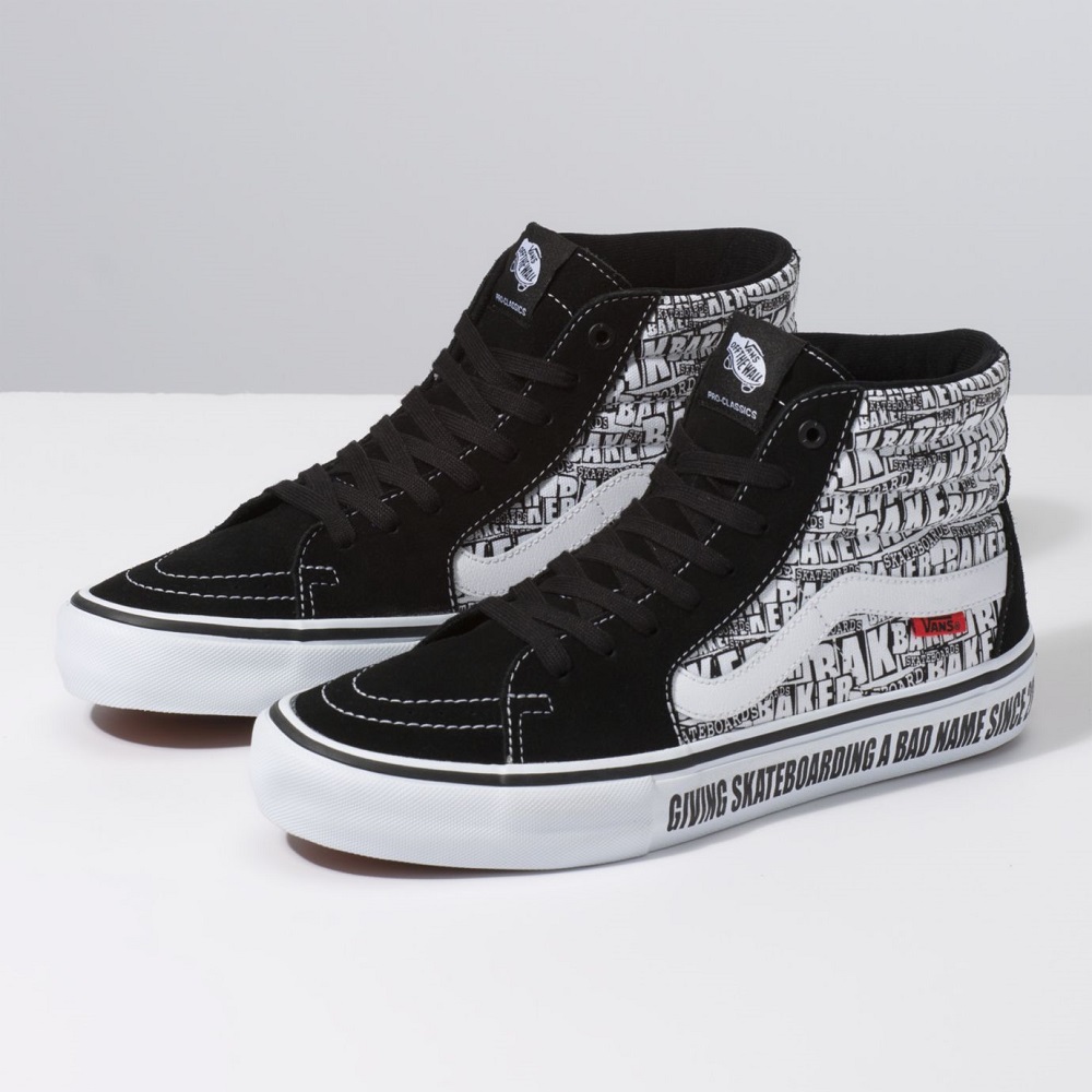 Bản Vans X Baker SK8 – Hi Pro tông màu trắng đen, cổ cao cũng là mẫu được nhiều người chú ý. Họa tiết phần hông giày là hàng loạt các chứ Skate vẽ nổi trên nền đen đã khiến đôi giày cực kỳ bắt mắt.