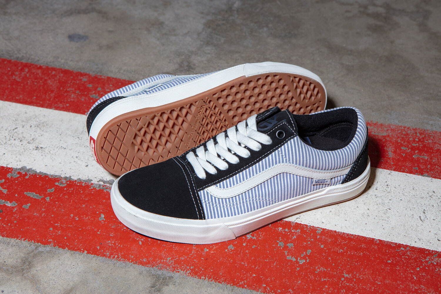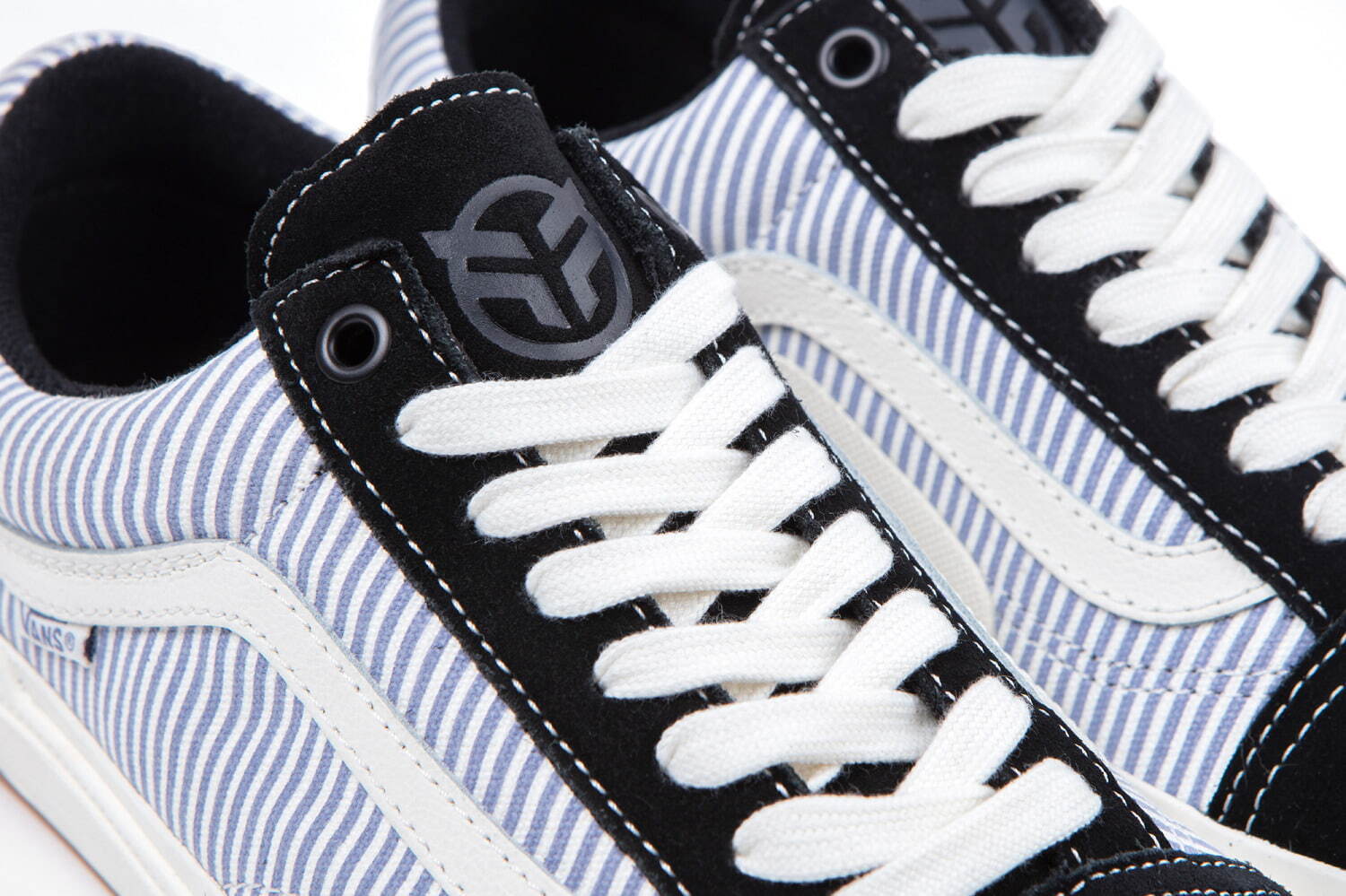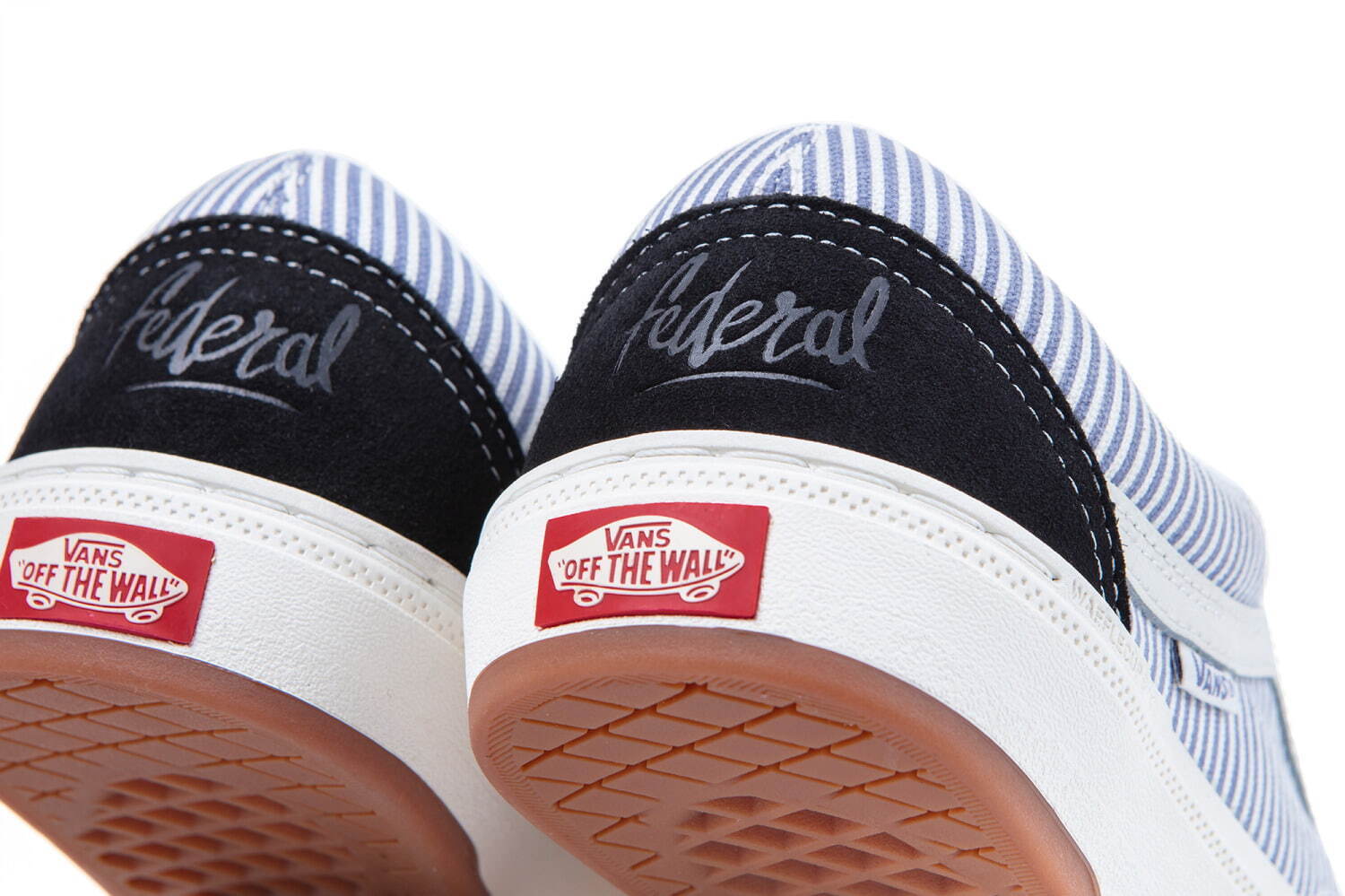 Lấy cảm hứng từ bộ sưu tập Anaheim Factory của VANS, Old Skool BMX có phần trên bằng da lộn màu đen và vải canvas sọc trắng xanh vô cùng lạ mắt. Logo đặc trưng của Federal được viết cách điệu tạo nên vẻ ngoài phủ trên lưỡi gà, cũng như trên gót chân.
