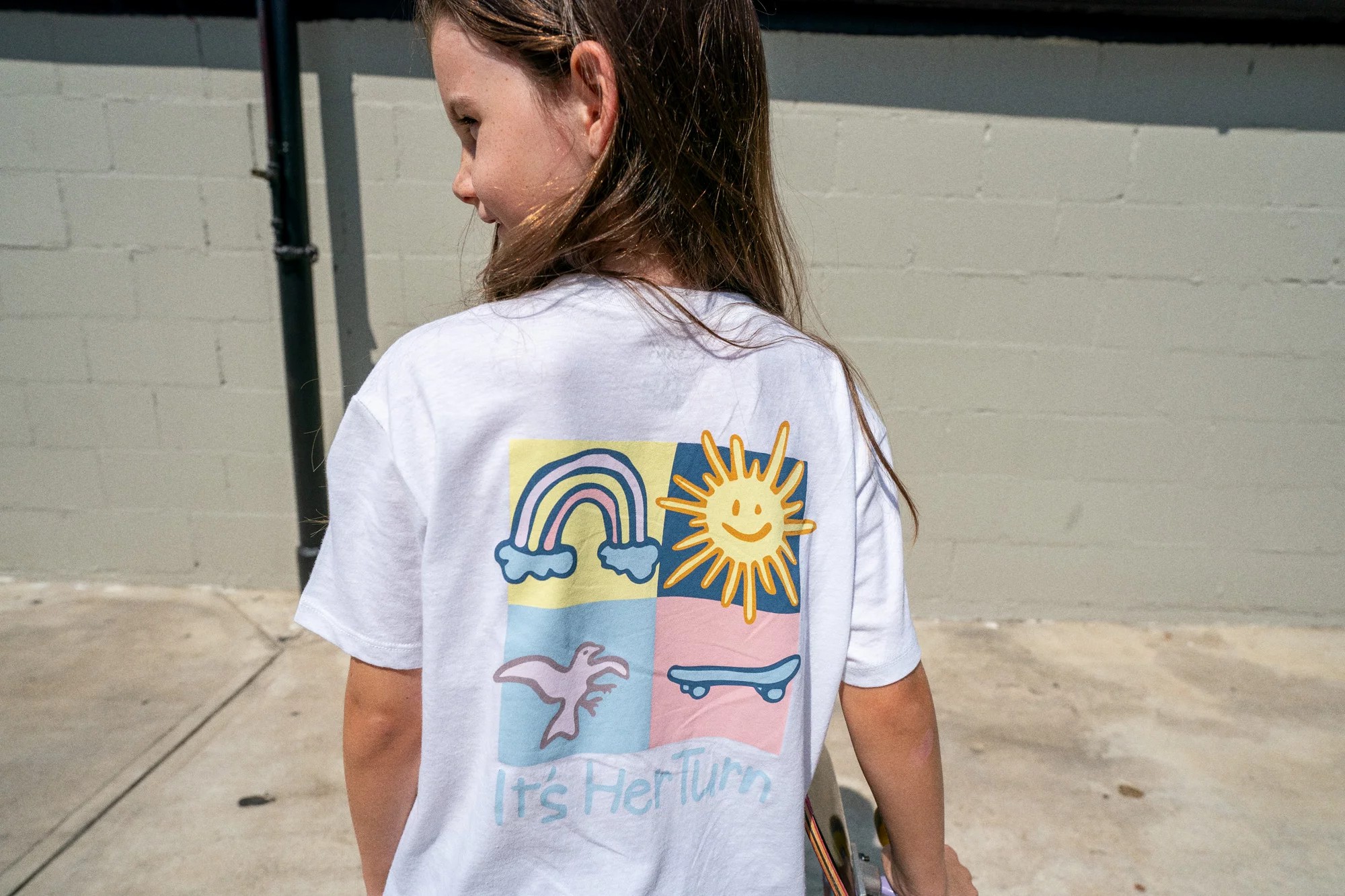 Đối với trang phục dành cho phụ nữ, một chiếc áo khoác bằng vải cotton đan chéo chắc chắn màu đen có khóa kéo phía trước và dòng chữ “It’s Her Turn” ở mặt sau— một dấu hiệu cho thấy sự vô địch của Skateistan trong việc trao quyền cho phụ nữ thông qua môn trượt ván. Chiếc áo khoác kết hợp tốt với những điểm cơ bản bao gồm áo phông kiểu jersey và một chiếc tất có gân nhẹ với nghệ thuật vật liệu jacquard. Một chiếc quần dài bằng vải cotton đan chéo và ba lô Realm có các chi tiết của Bàn cờ caro cũng như các biểu tượng thêu bằng silicon của VANS và Skateistan.