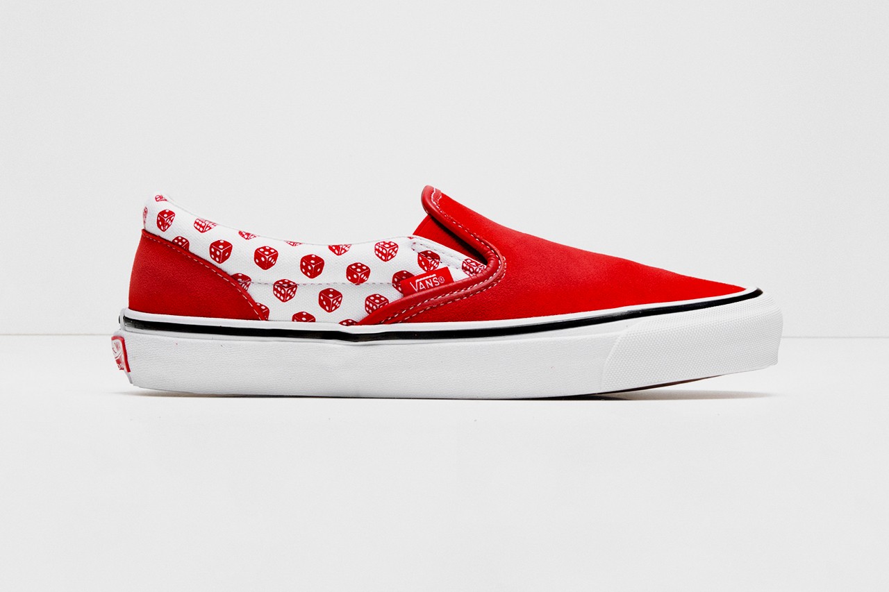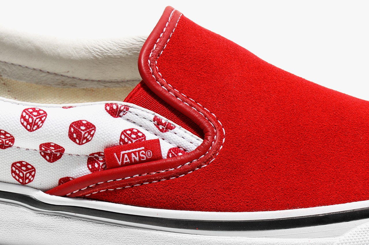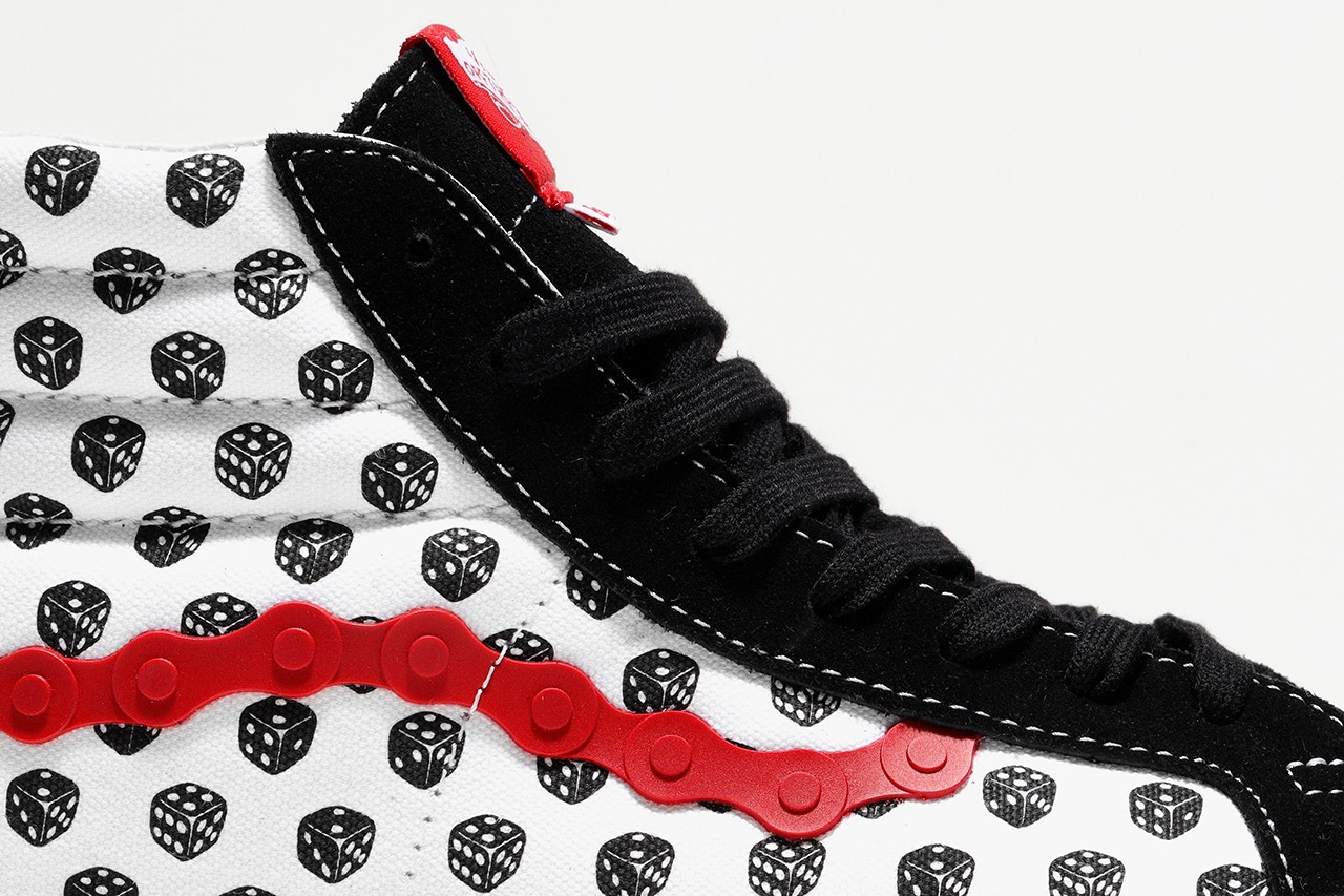 Bộ đôi tuyệt phẩm BODEGA x VAULT BY VANS HIGH STAKES được thiết kế bởi phong cách phóng khoáng và mang hơi thở của những câu lạc bộ về đêm. VANS SLIP-ON lấy tone nền đỏ - trắng nổi bật làm chủ đạo cho toàn bộ sản phẩm, kết hợp cùng hoạ tiết cách điệu mới lạ mang phần nhiều tính trừu tượng - hình những viên xúc xắc được in tỉ mỉ hai bên thân giày. Ngoài ra đối với phiên bản VANS SK8-HI lại mang gam màu đen - trắng chủ đạo, cũng vẫn với hoạ tiết in trừu tượng tỉ mỉ bao phủ hai bên hông giày. Nhưng, điều khiến cho BODEGA x VANS SK8-HI nổi bật là phần logo JAZZ STRILE được thiết kế cách điệu một cách nghệ thuật cùng màu đỏ bật tone tương đồng cùng logo thương hiệu nhà VANS.