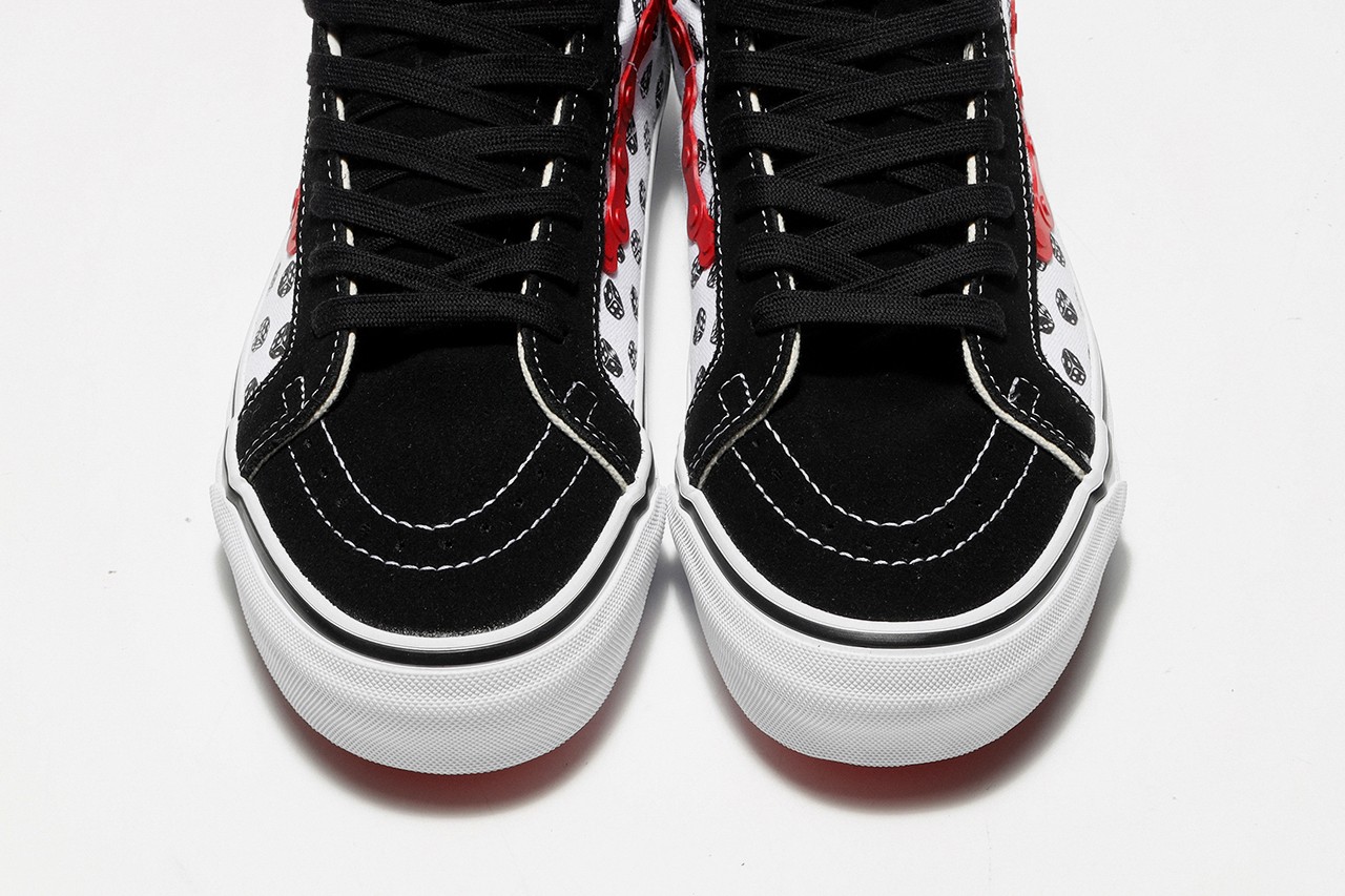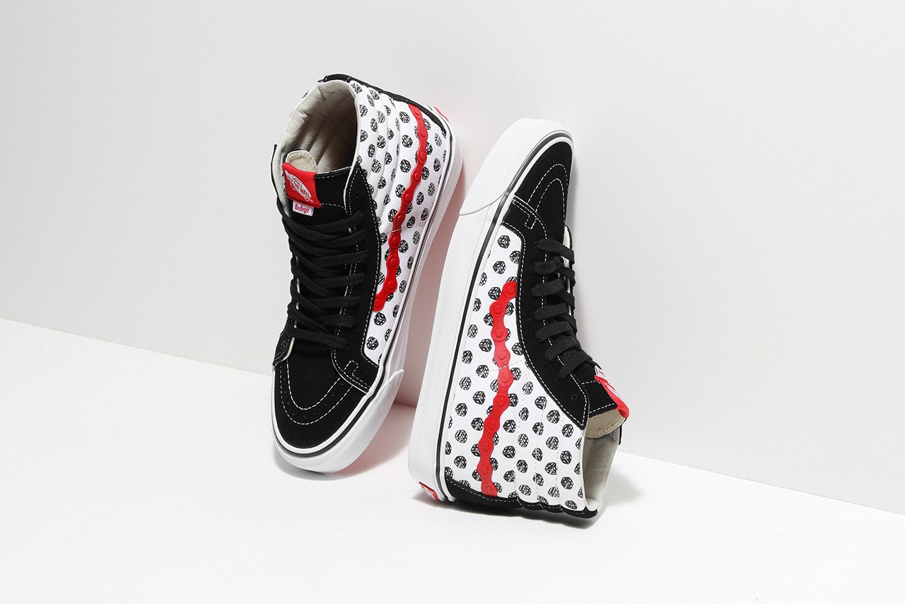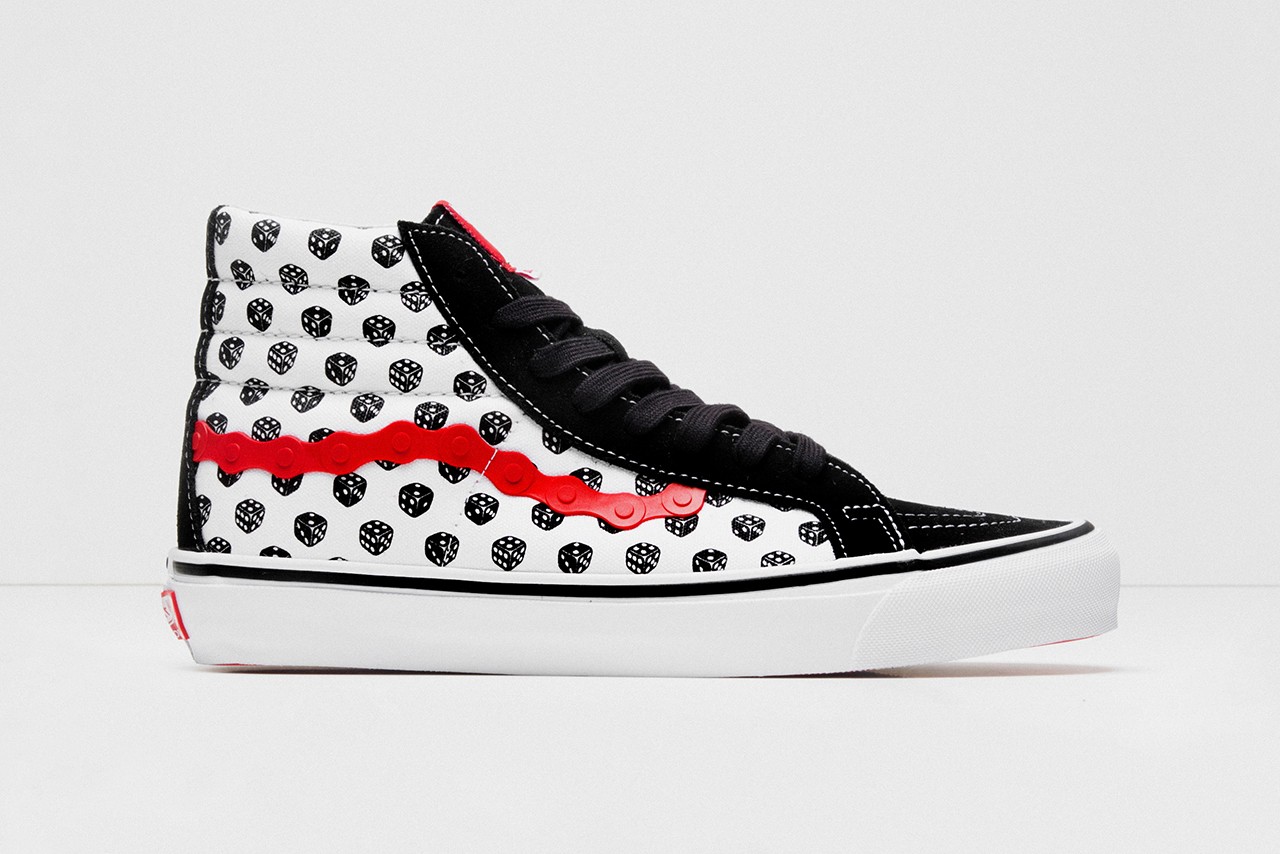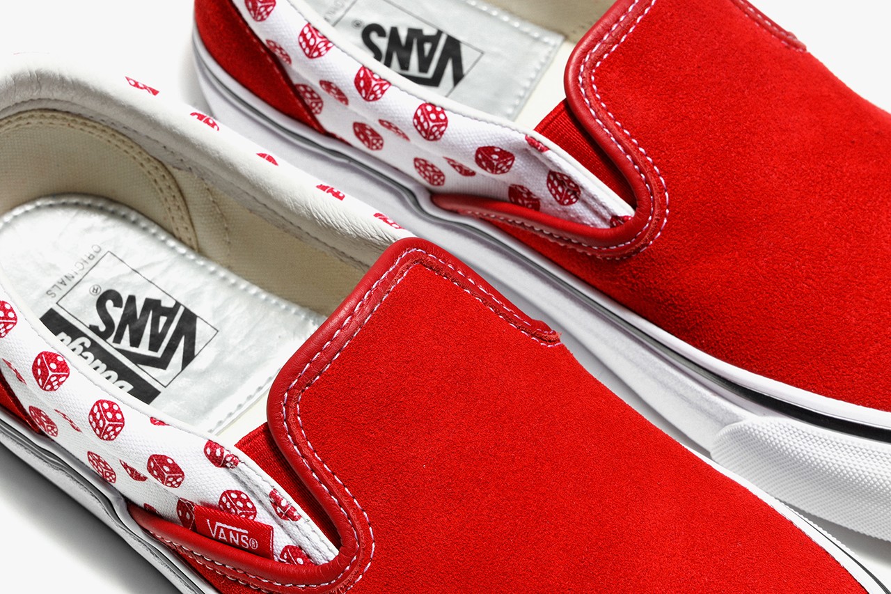 Bộ đôi tuyệt phẩm BODEGA x VAULT BY VANS HIGH STAKES được thiết kế bởi phong cách phóng khoáng và mang hơi thở của những câu lạc bộ về đêm. VANS SLIP-ON lấy tone nền đỏ - trắng nổi bật làm chủ đạo cho toàn bộ sản phẩm, kết hợp cùng hoạ tiết cách điệu mới lạ mang phần nhiều tính trừu tượng - hình những viên xúc xắc được in tỉ mỉ hai bên thân giày. Ngoài ra đối với phiên bản VANS SK8-HI lại mang gam màu đen - trắng chủ đạo, cũng vẫn với hoạ tiết in trừu tượng tỉ mỉ bao phủ hai bên hông giày. Nhưng, điều khiến cho BODEGA x VANS SK8-HI nổi bật là phần logo JAZZ STRILE được thiết kế cách điệu một cách nghệ thuật cùng màu đỏ bật tone tương đồng cùng logo thương hiệu nhà VANS.